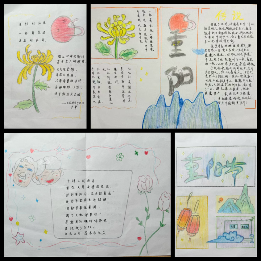 手抄报与贺卡绘画活动中,同学们巧思巧绘,将重阳意蕴融入方寸之间。手抄报以茱萸、菊花、登高元素为点缀,搭配“老吾老以及人之老”的短句,简约而深情;贺卡绘画则更显温情,有的手绘长辈慈祥的面容,有的用彩笔勾勒陪伴场景,附上“愿您福寿安康”“感恩您的守护”等暖心寄语,每一笔都饱含对长辈的敬爱与祝福。